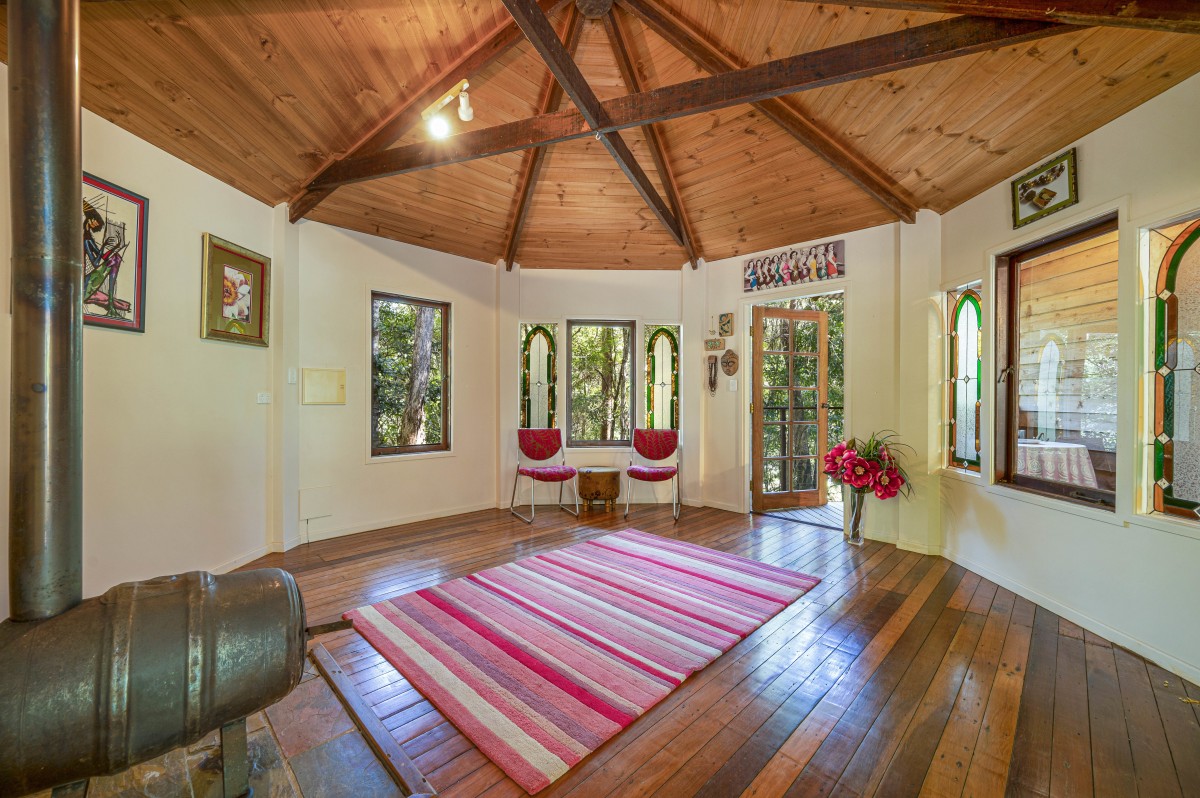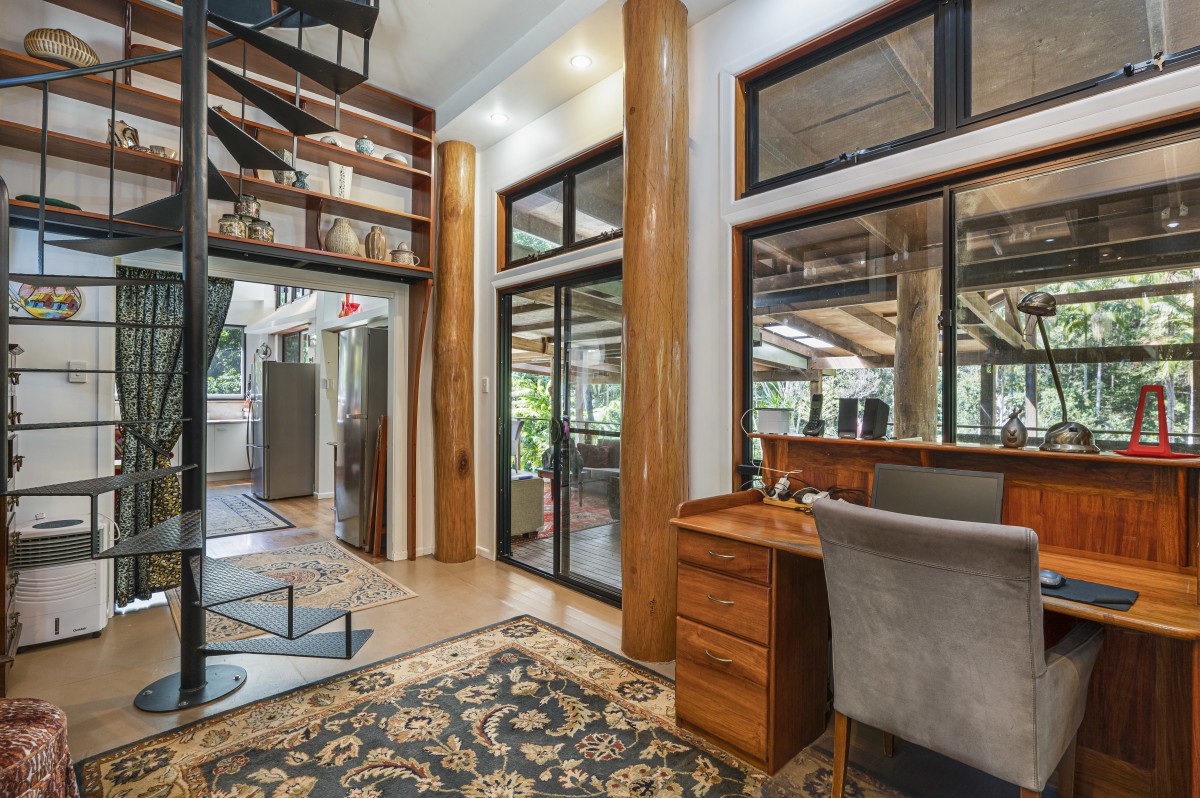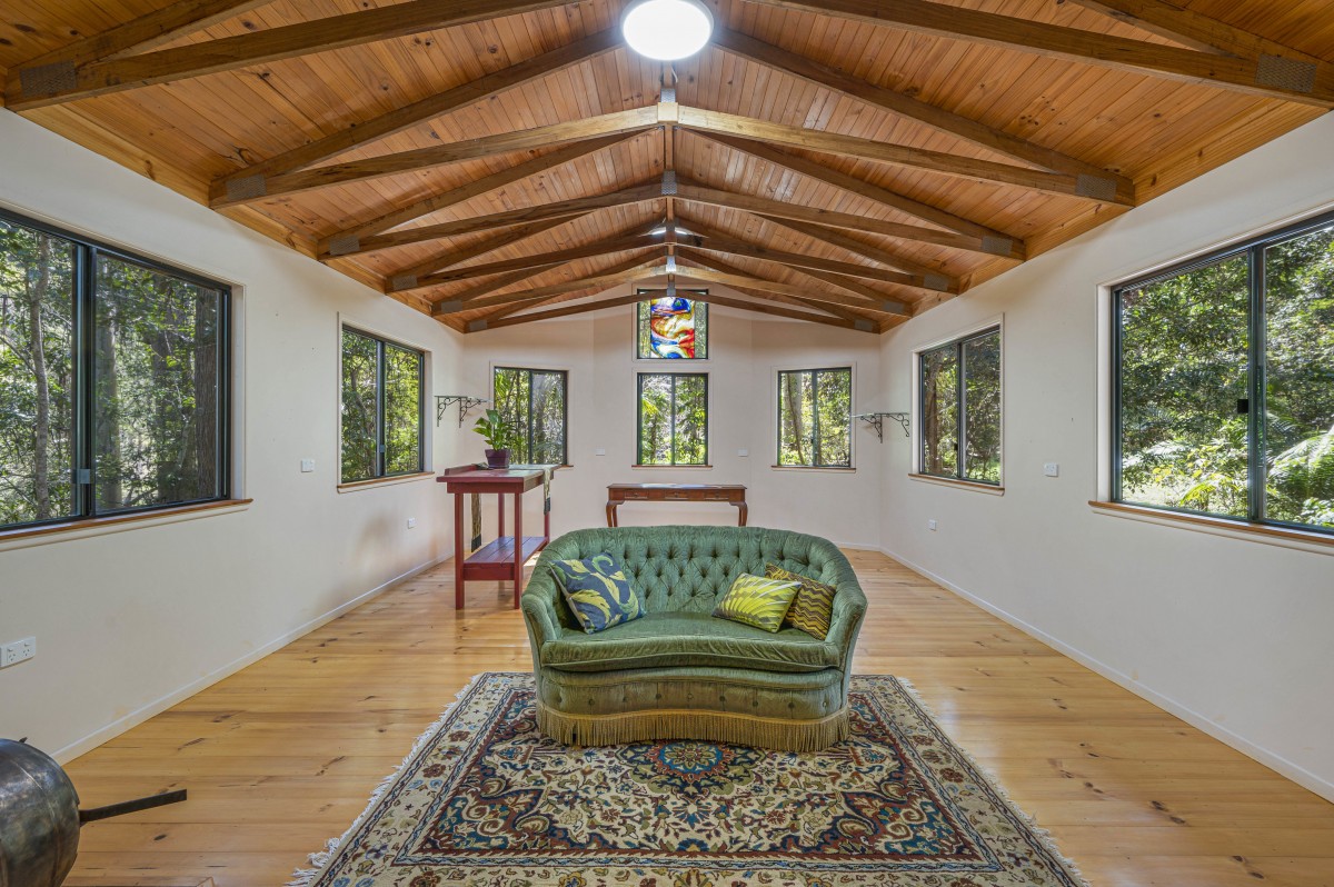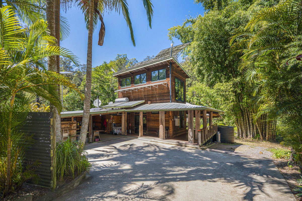 Nestled in the heart of the bush, this enchanting, artistically designed home is washed in dappled light and located beside a babbling creek. Set on a supremely quiet country road the property is just a 25-minute drive from Maleny town centre.