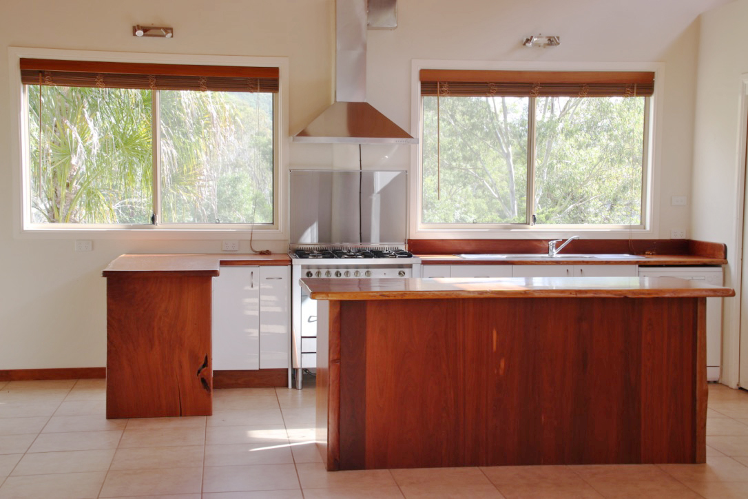 - Kitchen has timber bench tops with large gas cooktop and electric oven