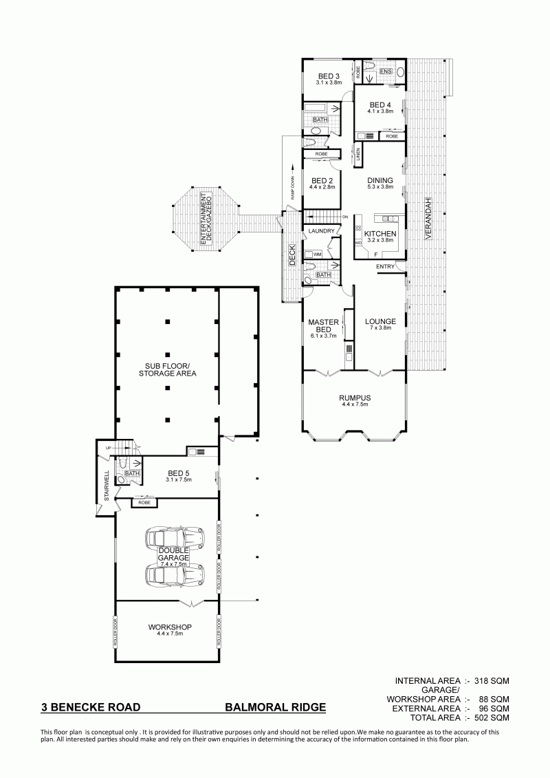 * Downstairs features the oversized double lock up garage, 4.4m x 7.4m workshop and the 5th guest bedroom with ensuite