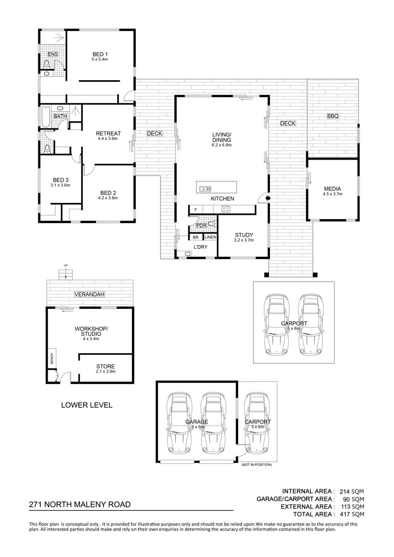 * 6m x 6m caravan height carport attached to house for all weather access, 6m x 6m lock up garage with three phase power, 3m x 6m carport for cars, boats or other toys